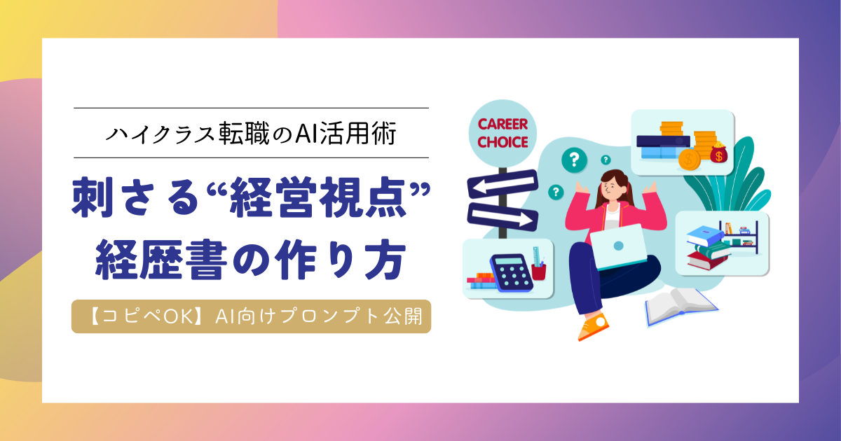 ご自身の経歴が「経営視点」でどう評価されるのか、まずはAIを使って棚卸しをしてみてください。そして、ブラッシュアップされた経歴書を武器に、ご自身の「本当の市場価値」を正しく評価してくれる環境を探してみてはいかがでしょうか。